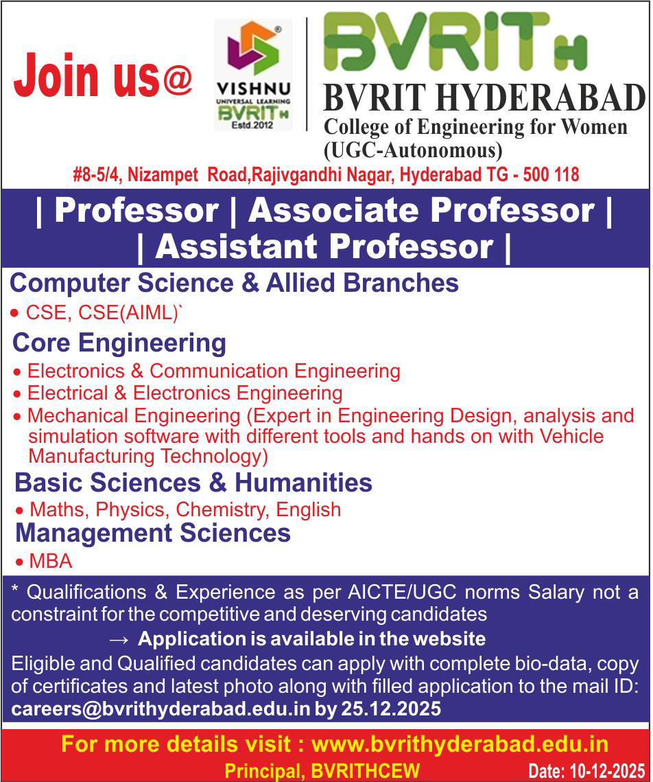 BVRIT HYDERABAD College of Engineering for Women is the youngest college under the umbrella of Sri Vishnu Educational Society, Established in 2012, with the intention of enabling women engineers to reach greater heights, it has already acquired many accolades in academics, placements and technical competitions. With exceptional results of very first batch, BVRIT HYDERABAD is now one of the most sought after institute in Hyderabad for prospective engineering students.