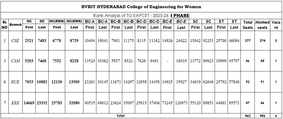 EAMCET – (2020-2021) rank analysis of branch wise admissions at BVRITH